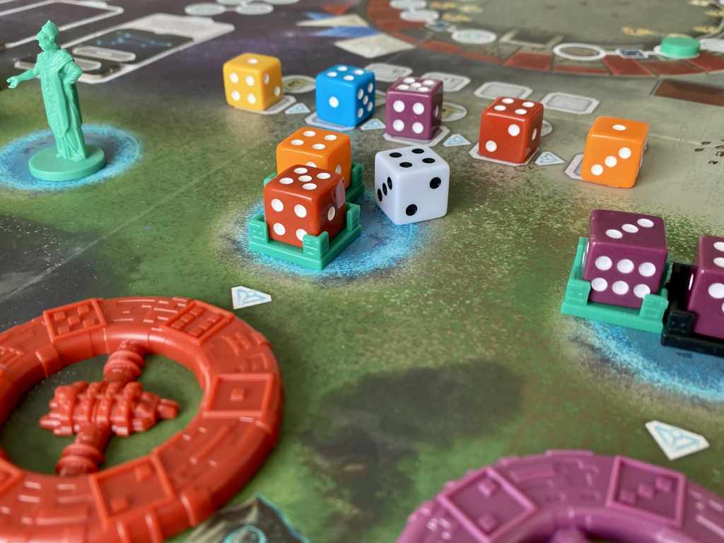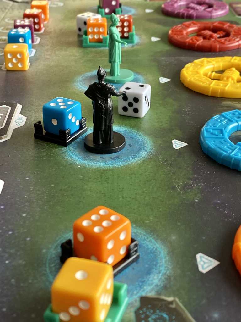 Et c’est tellement dommage car la mécanique, elle, survole le débat. Elle emporte tout sur son passage, les rencontres avec les extraterrestres, les constructions de Tours et j’en passe… Non parce que la thématique, on y pense pas une seule seconde. Remarque, c’est peut être presque pas plus mal quand on se penche sur le schmilblick… Revenons a nos montons, enfin plutôt à nos dés, qui placés dans des socles deviennent des stratèges. Oui, chaque mot à son importance… Ou pas… Bref ! Leurs placements, tel des ouvriers, selon leurs faces et leurs couleurs, mais surtout selon la position de la roue choisie est une superbe invention. Cela crée une tension de chaque instant sur l’ordre des actions à mener selon les dés adverses encore disponibles. D’ailleurs, le reste apparaît presque superflu devant l’ingéniosité de cette machine de guerre ludique et la puissance de plaisir qu’elle génère.