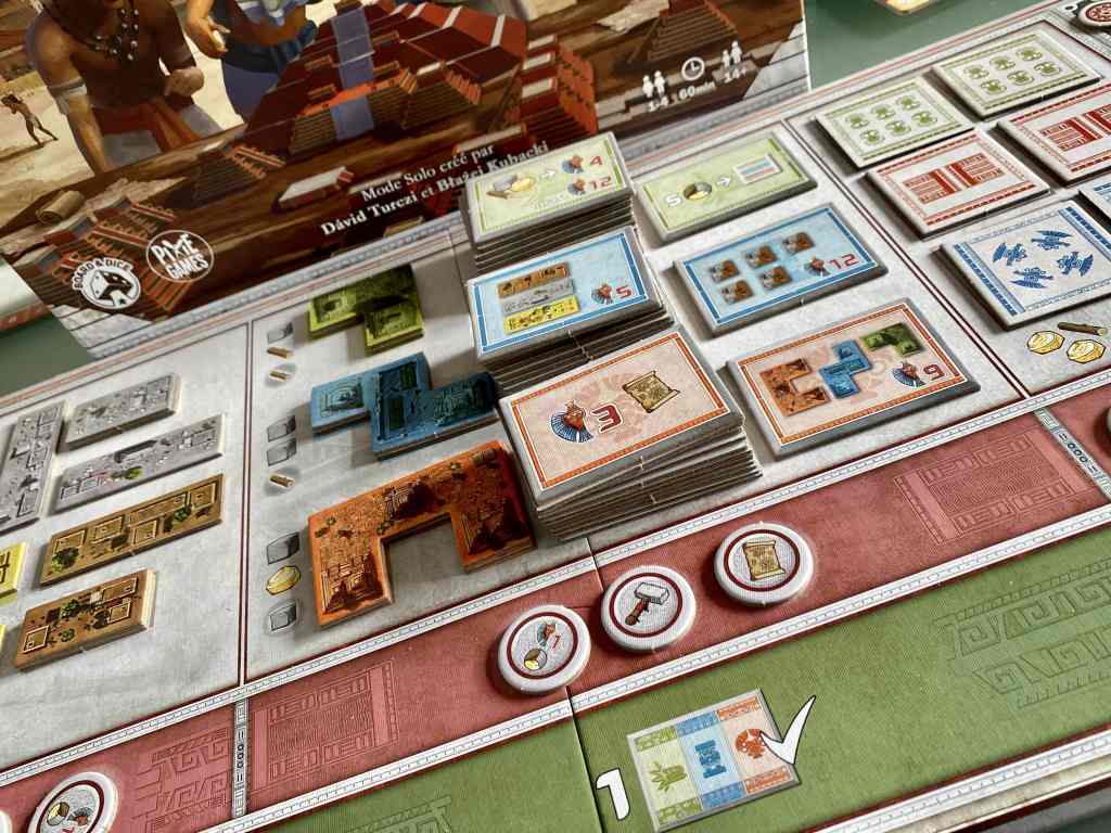 Mais tout ceci serait bien trop simple si l’architecte n’obligeait pas les joueurs à construire dans une zone précise et changeante d’un tour à un autre. La machine infernale se met alors rapidement à nous donner des sueurs froides et surtout le tournis car en apparence les choses apparaissent évidentes. Il faut construire des bâtiments pour se payer des temples à positionner en correspondance de couleurs dans les mêmes zones que les éléments de pyramide. Mais l’impression laissée et complexe et surtout très calculatoire.