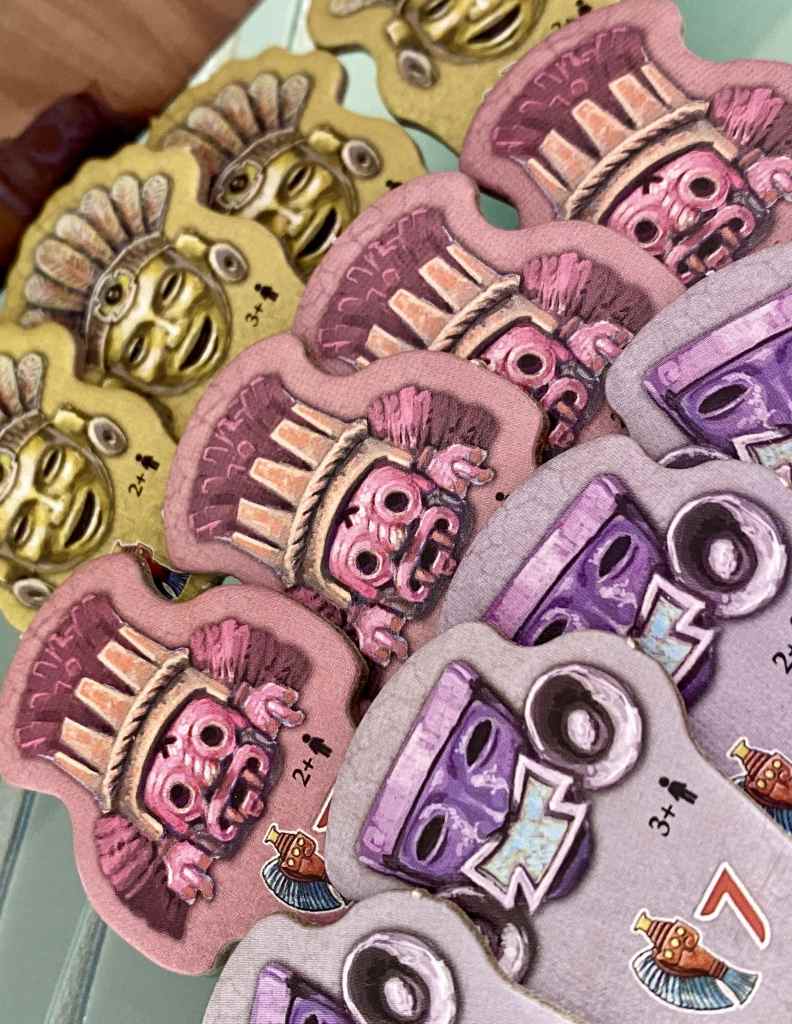 Si la pose d’un Bâtiment ou d’un Temple recouvre la dernière case d’un groupe de masque, le joueur actif récupère la première tuile Masque de la pile, pourvoyeuse de points de victoire.