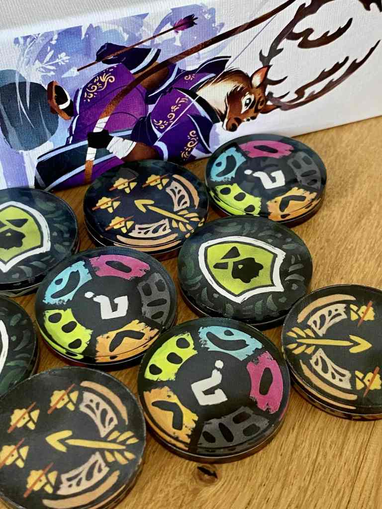 Pourtant une chose est sure, KYUDO en a de la plus-value ! Déjà les illustrations de Camille Chaussy sont à tomber, comme d’habitude. Ensuite, le matériel est dingue, et qui plus est, pratiquement entièrement fabriqué en France. Le tapis de jeu inclus est unique, les cartes sont « sleevées », les symboles des dés incrustés, les jetons sont en plexiglas, et le sac de rangement fait de l’effet. Les feuilles sont très lisibles et facilitent clairement les interactions. L’édition est franchement somptueuse. En conséquence et en toute logique, le prix s’avère un poil élevé pour un jeu de ce calibre.