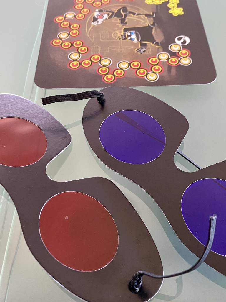 Les joueurs vont donc incarner deux cambrioleurs essayant d’amasser le plus de pièces possibles en évitant les lasers de sécurité. Chaque joueur ne peut voir qu’une seule couleur de laser à travers ses lunettes. Ainsi, l’un guide le second, qui lui, doit tracer son chemin à travers un labyrinthe fait d’obstacles et de quelques objets repères. S’il est possible en début de manche d’observer la salle à parcourir et de repérer les itinéraires les plus efficaces, il apparaît bien difficile de se souvenir de quoique ce soit une fois les lunettes chaussées. La perte de repère fonctionne à merveille. Il reste donc comme unique solution, une communication sans faille pour parvenir jusqu’aux pièces convoitées et surtout vers la sortie.