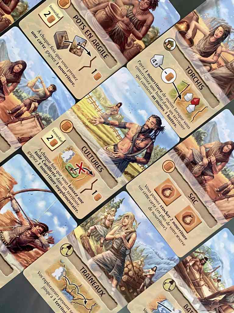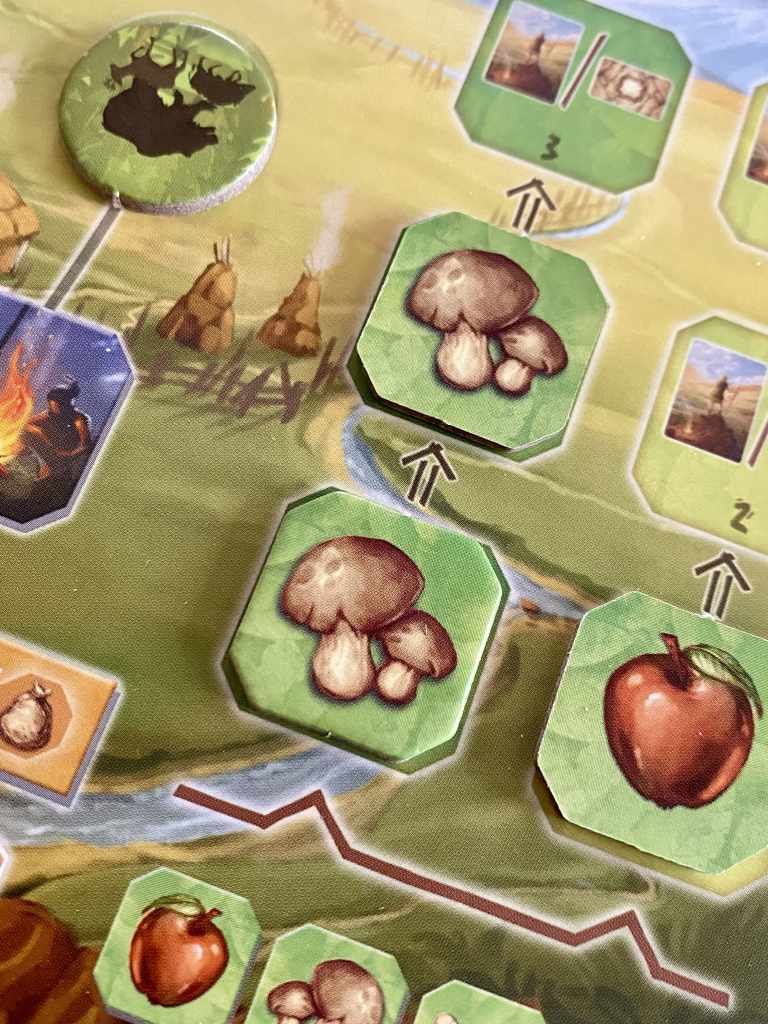 ° Cueillette : Récupérer la tuile cueillette de même type qu’une collection entamée ou prendre deux nourritures. La deuxième et troisième tuile, de même type collectionnée, permet de récupérer une carte Invention (capacité permanente) ou points de victoire (à poser sur une invention, annulant ainsi son effet).