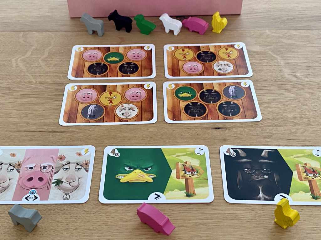 Assez parlé du décor, rentrons maintenant dans le « pif » du sujet ! Dans FARM CLUB, les joueurs vont construire leur ferme en neuf tours de jeu. Ainsi, ils placeront des animaux dans des enclos et récupéreront des objectifs. Ces deux éléments sont liés entre eux. Ils choisiront donc, à chaque tour, un duo Animal / Objectif même si ces deux constituants ne forment pas franchement un couple harmonieux. Bonjour CASCADIA ! Le but est bien évidemment d’agencer les animaux entre eux afin de satisfaire les exigences des cartes Objectif. C’est simple, simple, basique et surtout peu original.