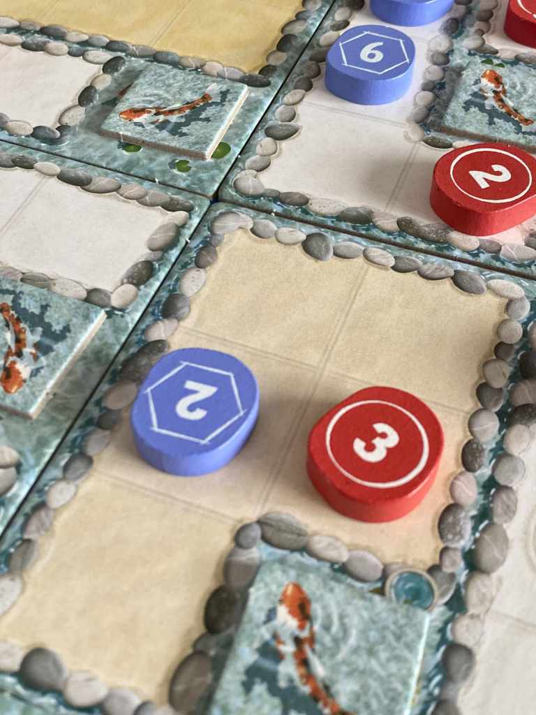 En effet, les joueurs auront deux objectifs en tête, quasiment opposés. Ils devront positionner des galets de valeurs faibles autour des bassins et en accumuler d’autres de plus fortes valeurs afin de s’approprier les points de victoire des jardins en fin de parties. Ce cas de conscience permanent entre « jouer petit » et « mettre du lourd » est véritablement malin et plaisant.
