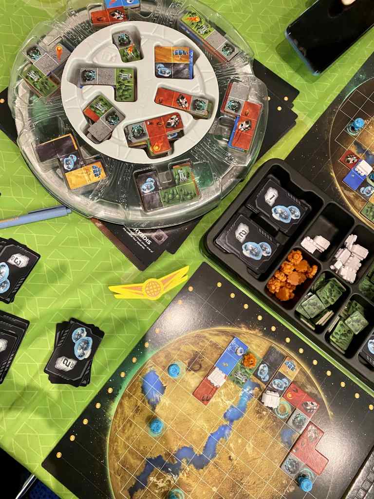On en a entendu beaucoup parlé ces dernières semaines. Planet Unknown propose de développer une planète en posant des tuiles, qui selon leur nature développent nos capacités. En gros, il s’agit de faire tourner le plateau de tuiles, d’en choisir une dans les « inserts » en face de nous, imposant par la même occasion les choix adverses, de la positionner sur la planète et d’augmenter les curseurs associés, ce qui permet davantage de possibilités pour la suite. Je m’attendais à beaucoup mieux. C’est très mécanique et ce début de partie ne m’a pas franchement emballé. Cela dit, je suis loin d’avoir saisi toutes les subtilités en quelques tours de jeu. Je reste curieuse.