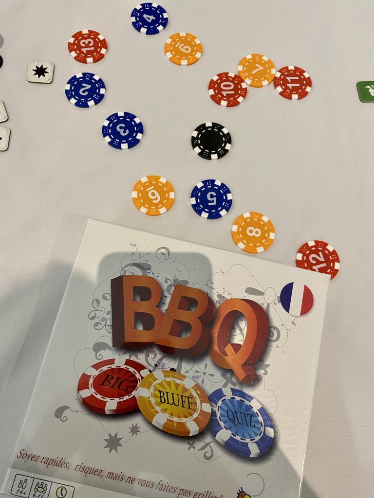 Entre ambiance et culture générale, BBQ n’a pas su choisir. L’édition est quelque peu extravagante avec des jetons « Poker » imposant, mais n’apportant pas de plus-value au titre. À l’inverse, les questions et les réponses apparaissent minuscules sur les cartes. Il s’agit de se jauger sur un nombre possible de réponses capables d’être données à une question. Les questions sont d’ailleurs assez complexes… Je passe mon tour.