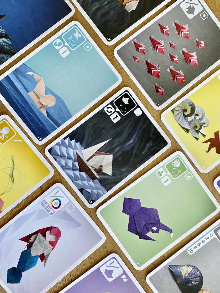SEA SALT & PAPER tient dans la main, mais ne fond pas, rassurez vous ! D’ailleurs, ce sont plutôt les joueurs qui fondent devant les illustrations des cartes, faites d’Origamis photographiés dans un décor minimaliste, permettant de mettre en avant ces œuvres d’art en papier.