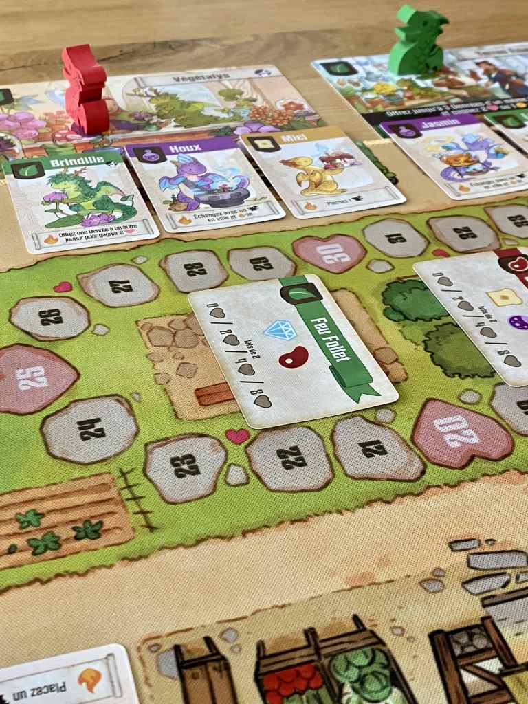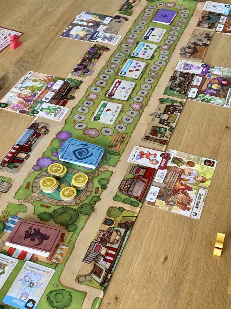 Parlons maintenant de l’essentiel, à savoir de la mécanique et des sensations qu’elle procure. Comme déjà évoqué, elle s’avère plutôt classique. Il s’agit de récupérer des ressources pour les livrer contre des points de victoire. Mais, FLAMECRAFT se distingue par la forme que prend cette course aux objectifs. En effet, le plateau de jeu va évoluer tout au long de la partie et permettre de plus en plus de possibilités, créées par les joueurs eux-mêmes. En ajoutant progressivement des dragons dans les boutiques, les lieux deviennent en effet de plus en plus prisés. La mécanique, plutôt commune en apparence, devient alors franchement originale. Les joueurs devront alors s’organiser au mieux pour profiter du lieu le plus adapté et lucratif à un moment donné.