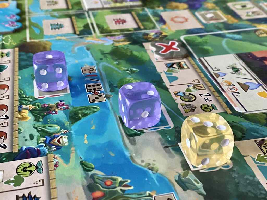Oui, car un tour de jeu en lui-même n’est pas si ardu. Il suffit de poser une carte ou un dé et de réaliser l’action correspondante. De plus, les choix ne sont pas, non plus, extrêmement nombreux. On est loin de la profusion de possibilités d’un À la Gloire d’Odin, pour ne citer que lui. Il y en a un bon nombre certes, mais on parvient assez rapidement à tous les appréhender. Ce qui est troublant est le mélange de toutes ces possibilités. On peut en effet se poser dans une zone facilitant la construction pour au final pouvoir bénéficier de déplacements par exemple. Ce gloubiboulga porte quelque chose d’extrêmement éprouvant lors de la première partie et de totalement réjouissant sur les suivantes.