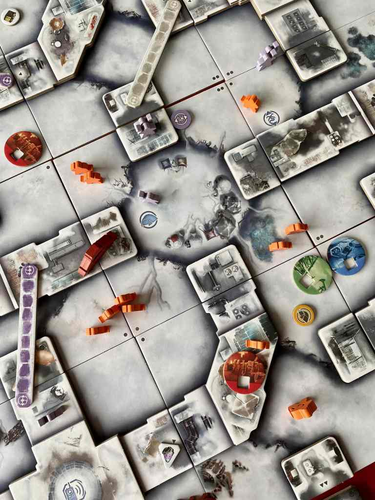 Le twist intelligent provient de la façon d’acheter de nouvelles cartes. Pour cela, il suffit de jouer une carte face cachée, qui sera sacrifiée pour le reste de la partie. Les nouvelles acquisitions réclament des ressources, mais aussi et surtout de contrôler des Avant-postes. En effet, le contrôle de territoires s’avère être le cœur du système de jeu. D’abord, parce que les déplacements et la collecte de ressources n’est possible que dans des zones où l’on est majoritaire. Aussi, parce qu’obtenir la majorité dans deux régions possédant un Avant-poste octroie des avantages permanents stratégiques. La possession de ces Avant-poste est également souvent un des objectifs à réaliser et octroie des points de victoire en fin de partie.