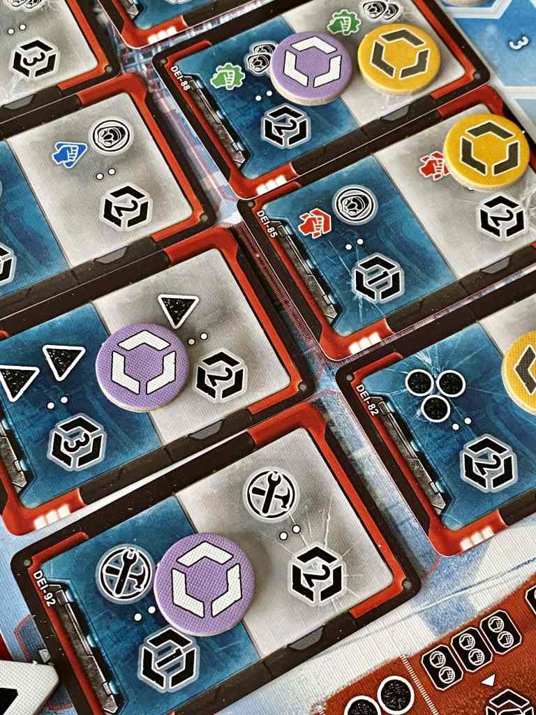 Cette atmosphère est extrêmement bien concrétisée par un matériel froid et à l’apparence hostile. Les différents plateaux en trois couches superposées sont modulables et de très bonne facture même si leur assemblage vous fera perdre une bonne heure avant votre première partie. On peut regretter la toute petite épaisseur des différents plateaux accueillant les cartes même si la boîte est déjà suffisamment imposante, et qu’en réalité, ils remplissent tout aussi bien leur fonction ainsi. Les pions Ferrailleurs sont stylés et les cartes épurées sont complètement encrée dans l’ambiance du jeu. En résumé, côté matériel, et à condition d’adhérer à son style « de fin du monde », D.E.I. fait franchement de l’effet.