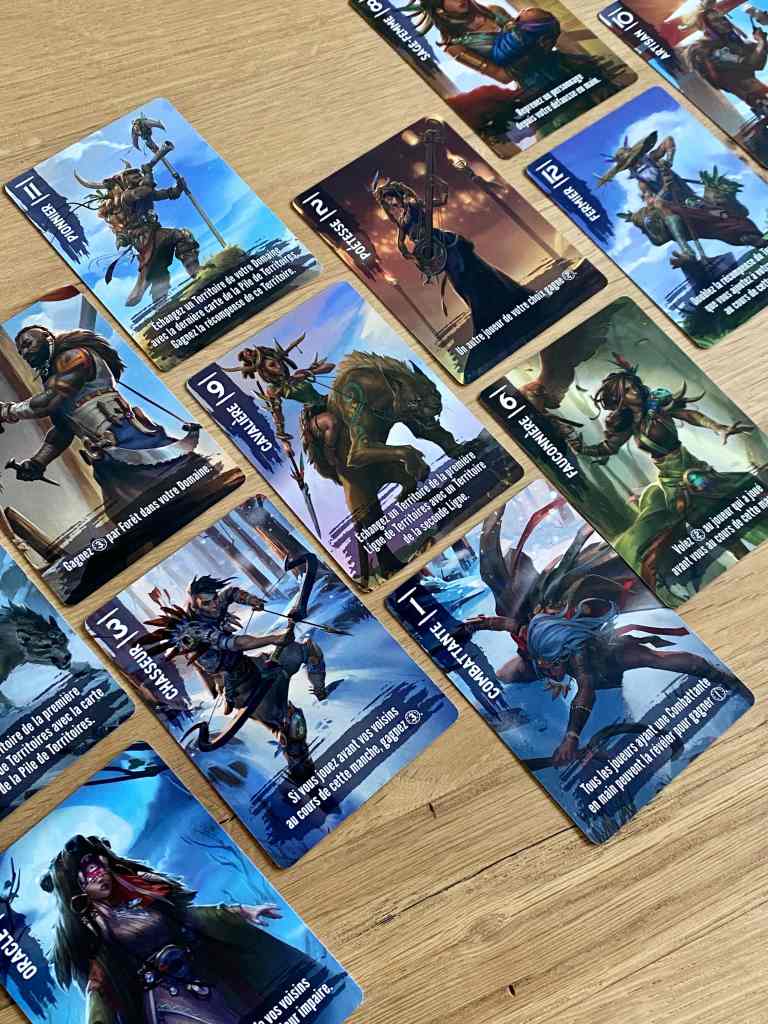 – Fin de manche. Lorsque tous les joueurs ont effectué leurs deux actions, les cartes de la deuxième ligne de Territoires passent en première ligne alors que la deuxième ligne est complétée par de nouvelles cartes. Les joueurs piochent des cartes Personnages de leur pioche personnelle jusqu’à en avoir cinq en main.