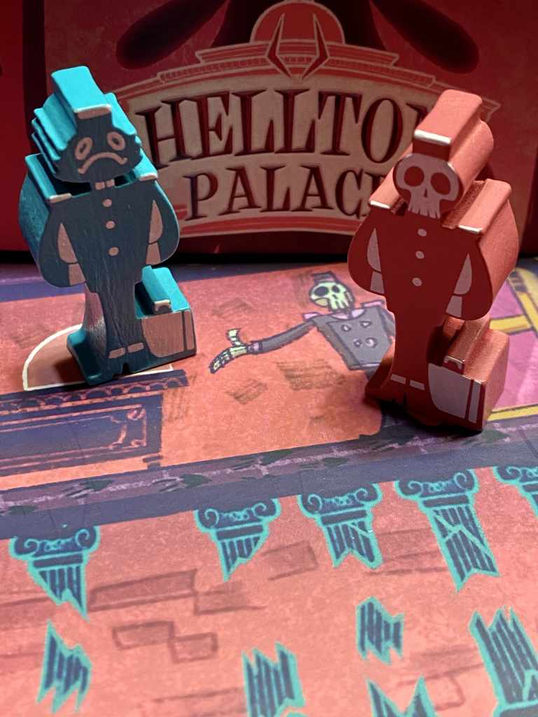 Pourtant, il le faudrait, car sur le papier, HELLTON PALACE est un duel dans lequel l’objectif premier est de résister plus longtemps que votre adversaire. Oubliez l’idée, il s’agit clairement d’un jeu solo qui se joue à deux. À aucun moment, vous ne sentirez la présence d’un quelconque autre joueur. Vous verrez le nombre de cartes diminuer au fil de la partie mais sans percevoir l’adversité.