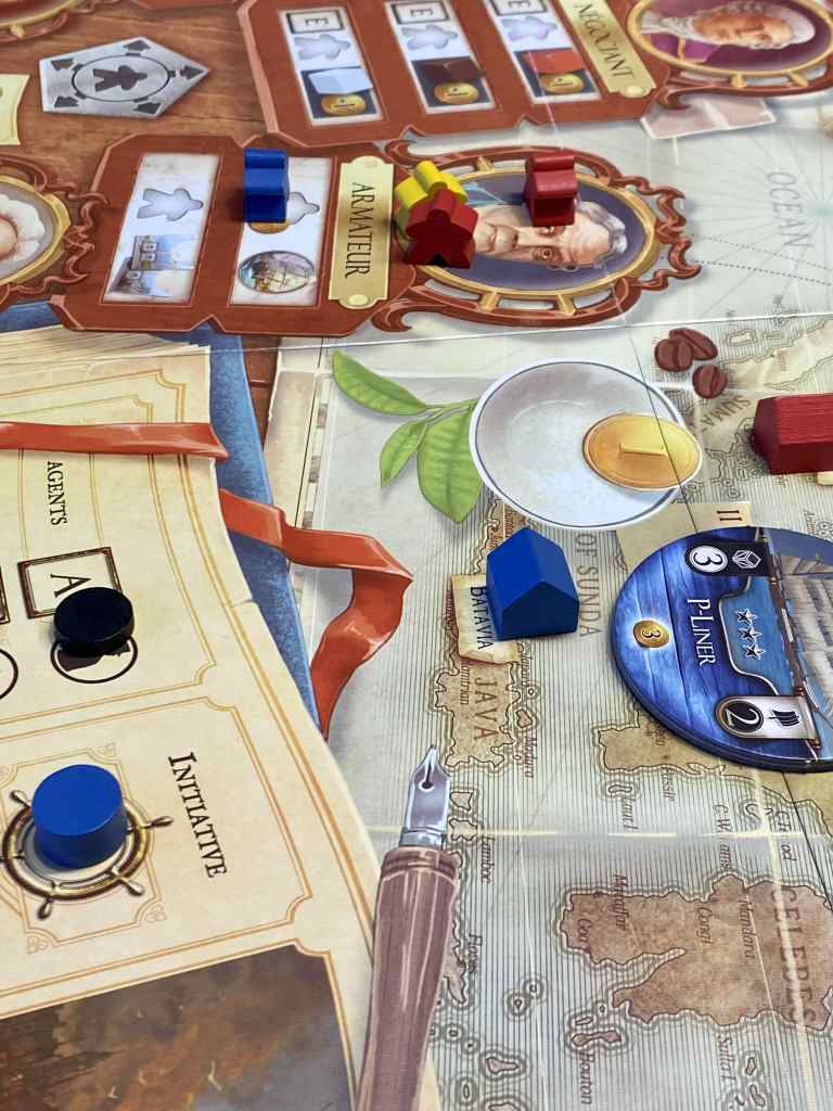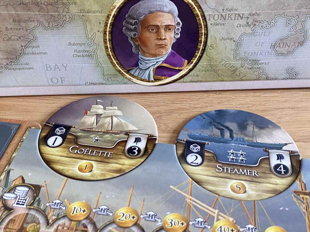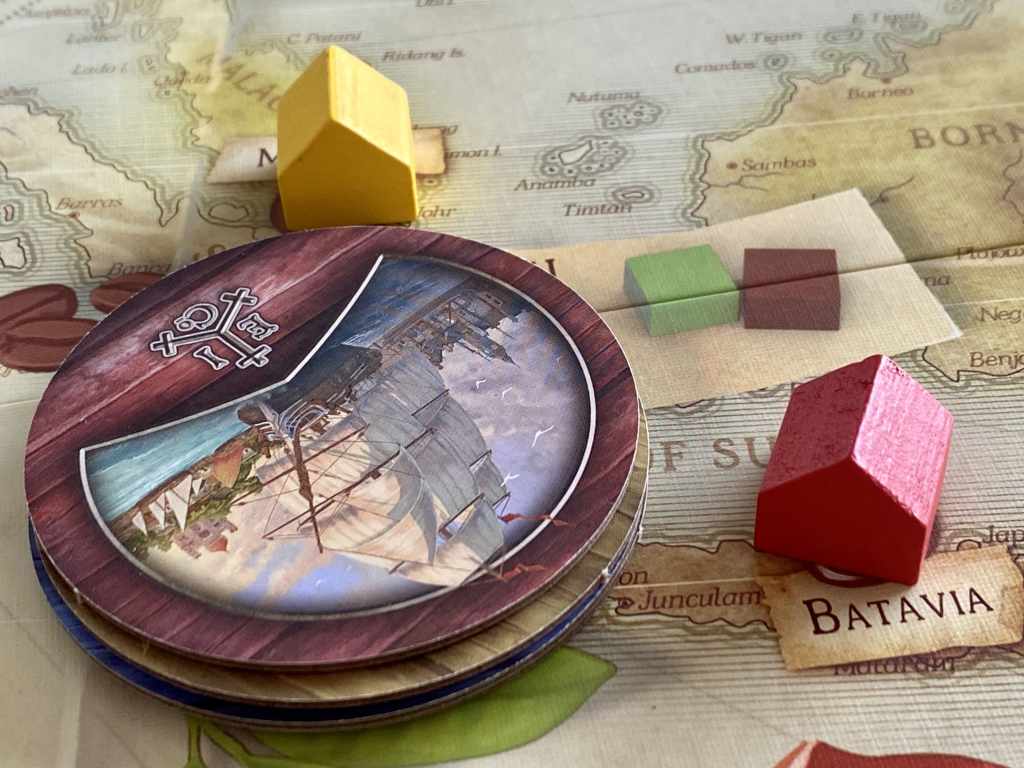 – Navigation. Au début de cette phase, deux cartes, Indes et Europe, sont piochées et positionnées face cachée dans leur Marché respectif. Puis, à tour de rôle, les joueurs placent un de leurs navires face cachée sur l’une des trois zones de Navigation. Certaines ont un coût d’accès.