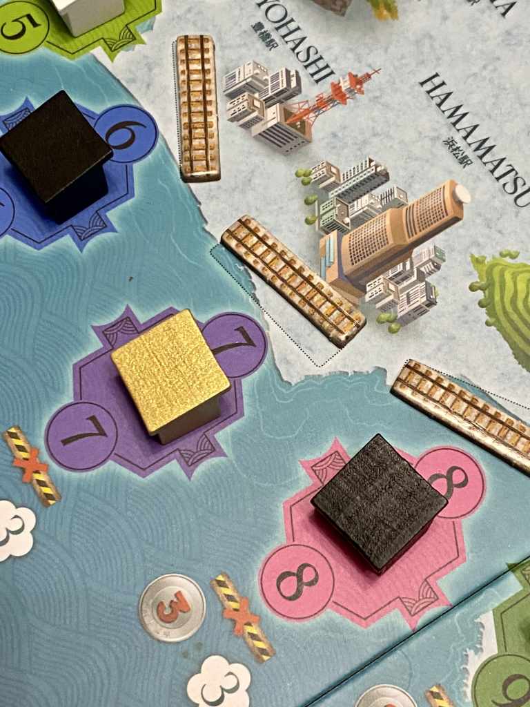 Seulement, tout n’est pas si rose au pays du soleil levant. Déjà, la gestion de l’argent est ultra tendue. De ce fait, il faut compter sur ses petits camarades. Mais SHINKANSEN n’est pas coopératif. Il faut donc inciter les autres joueurs à faire des travaux dans les villes que l’on possède communément. Autant vous dire que SHINHANSEN n’est pas un jeu de parlotte ! Non, les incitations passent par une chose bien plus sournoise : l’attente ! Quel joueur possédant Kyoto craquera en premier pour y construire une gare et qu’elle en sera sa couleur. Le jeu s’avère ainsi très fourbe. Il faut savoir construire pour sa pomme, sans que cela profite trop aux autres, et à l’inverse profiter des constructions des autres. De la même façon, il faut savoir influencer et surfer sur la valeur finale des gares pour tirer son épingle du jeu. L’ordre du tour est ainsi très important pour analyser quelles tendances se dégagent ou pour choisir en premier sa carte Train en début de tour.