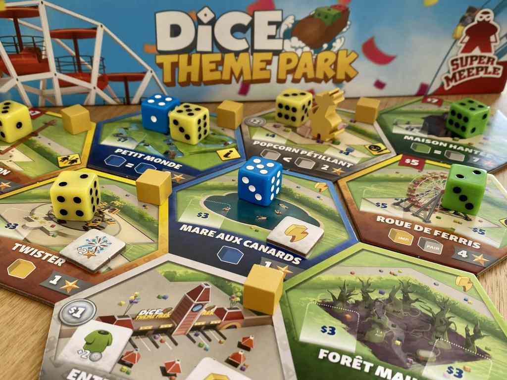 Après avoir tenté de sauver le plus de patients possibles dans DICE HOSPITAL, Super Meeple nous propose cette fois de convaincre le maximum de visiteurs de la grandeur de notre Parc d’attraction.
