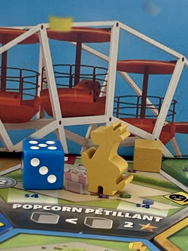 En effet, les joueurs devront optimiser au mieux leur espace de jeu. Les dés, symbolisant les visiteurs, vont servir d’activateurs de tuiles, concrétisant leur participation aux attractions. Plus les clients honoreront les différentes attractions, plus ils seront contents et rapporteront des points de victoire. Mais, un petit « looping » de trop risque de les fatiguer vite et de leur faire prendre la porte de sortie. Le thème est ainsi parfaitement concrétisé dans cette « promenade » de dés.