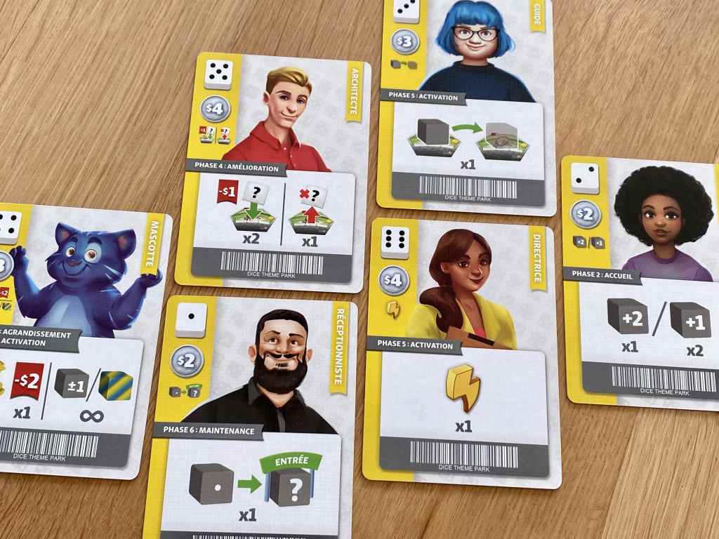– Agrandissement. Dans l’ordre du tour, les joueurs peuvent acheter une nouvelle tuile Attraction parmi celles disponibles pour la manche en cours. Posséder des attractions de même type offre des bonus instantanés. Il est également possible de recruter une mascotte contre cinq dollars.