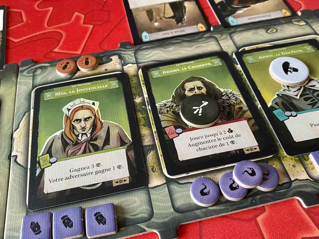 – Sur son plateau personnel. Deux actions sont communes aux deux joueurs : gagner de l’influence ou piocher une carte, ou jouer une carte et rendre un villageois disponible. Il s’agit de retirer le pion Action d’une carte villageois en sacrifiant un secret ou un indice de ce même villageois. Les autres actions possibles sont spécifiques :