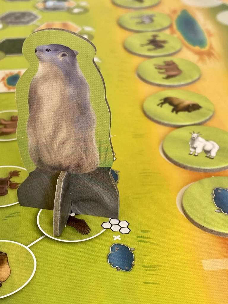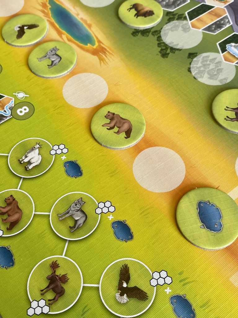 – Le joueur actif choisit un jeton Action, représentant une espèce animale ou un point d’eau, et l’associe à un prérequis de terrain du plateau principal.
