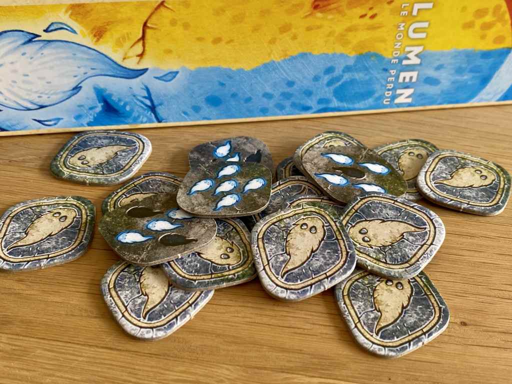 Déjà, LUMEN, c’est la création d’un univers particulier avec deux peuples, un de nuit et un de jour, qui s’affrontent. L’histoire qui nous est racontée donne au titre une plus-value non-négligeable et sincèrement attachante. Les illustrations qui découlent de cette invention fantaisiste sont très attirantes. Les couleurs vives et le style reconnaissable de Vincent Dutrait sont un réel bonus pour le jeu. De même, la forme des tuiles constituant le plateau de jeu attire l’œil et ne laisse pas insensible, même si la mise en place apparaît pénible. On peut tout de même reprocher au jeu un manque de lisibilité créé par cette volonté d’originalité excentrique.