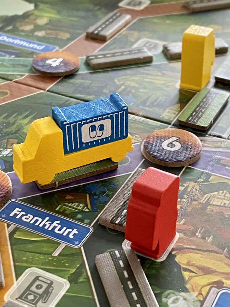 – Déplacer un ou deux camions situés dans une zone de même couleur que la carte jouée. Le nombre de sections pouvant être franchies dépend de la manche en cours. Les Stations-services octroient des bonus aux joueurs possesseurs dès qu’un camion passe devant l’une d’entre-elle. Si, à la suite d’un déplacement, un camion atteint l’extrémité d’une autoroute, il effectue une livraison. Il récupère ainsi une tuile Bonus s’il en reste sur le plateau, défausse sa marchandise. Si celle-ci correspond aux attentes du Pays livré, le joueur actif place un jeton Livraison sur l’icône Marchandise correspondante de son plateau. Sinon, il gagne la somme en Deutschemark du pays concerné.