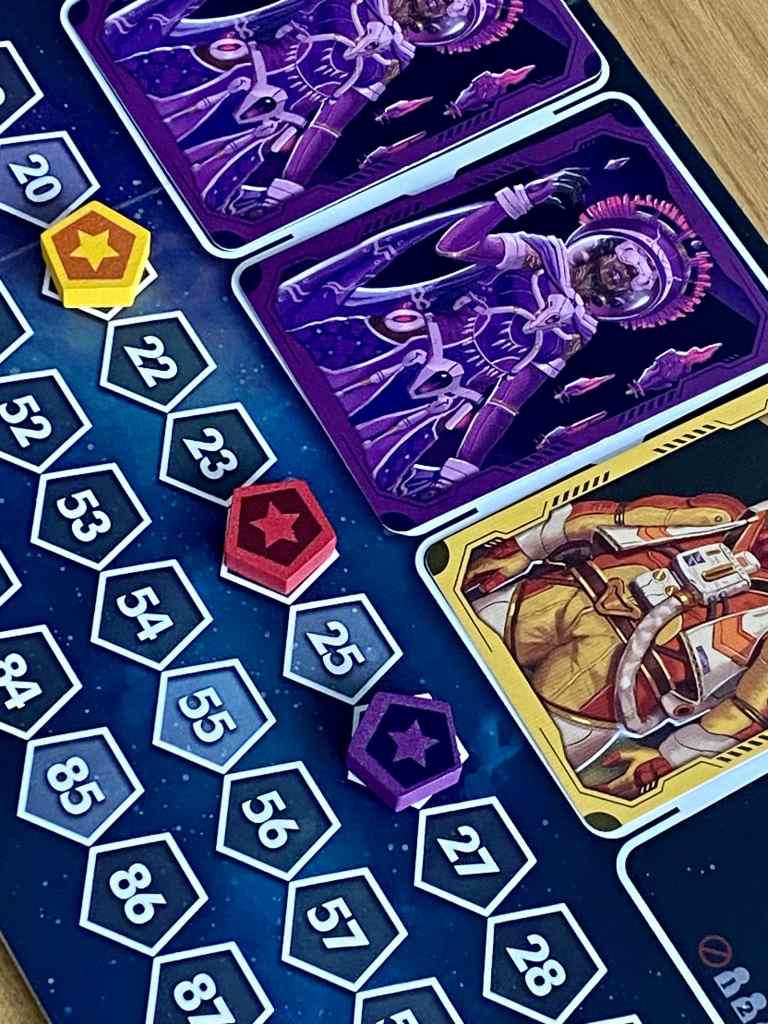 Plus haut, j’évoquais une « Course à la victoire ». C’est bien cela dont il est question. THE ARTEMIS ODYSSEY est une course aux points, mais présentant une réelle singularité dans la manière de les obtenir. Seuls les joueurs décident des moments de « scoring » et des éléments à prendre en compte pour ceux-ci. En effet, c’est en jouant une carte Score que le joueur actif décide pour tout le monde quand et comment les points seront marqués. Là encore, il s’agit de profiter de ce moment tout en désavantageant les adversaires, d’autant plus que le participant obtenant le plus de points se voit attribuer un bonus alors que celui en ayant récupéré le moins est sanctionné d’un malus. Ainsi, il ne s’agit pas d’attendre toute la partie et le développement total de notre Compagnie pour déclencher des décomptes de points. À l’inverse, il faudra être attentif au terrain de jeu pour remarquer les éléments personnels plus aboutis que ceux de nos adversaires afin de profiter de cette avance. THE ARTEMIS ODYSSEY devient alors un jeu de « court-circuitage » aux sensations véritablement singulières et rafraîchissantes. Il met en scène une course au développement contre les autres, et dans laquelle il faudra en permanence se démarquer.