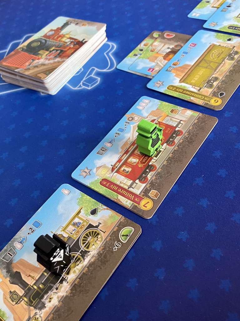 – Embarquer. Le joueur actif place une carte de sa main (pour prendre en compte sa cargaison) ou un passager de sa réserve dans un espace disponible de son train ou de celui d’un autre joueur. Cette dernière solution permet de déclencher le bonus indiqué sur le wagon chargé.
