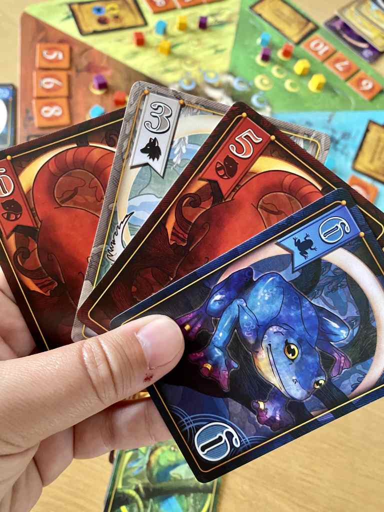 Le sujet, parlons-en ! LES ROYAUMES SAUVAGES est un jeu de cartes très accessible avec pour objectif de conquérir des majorités. Sur le papier, rien de très « folichon » ! Sauf quand on se rend compte que la sauce prend. Elle prend même très vite et avec assurance. À leur tour, les participants n’ont qu’à jouer une carte de leur main, les échanger avec la pioche ou passer. C’est simple comme bonjour. Mais le but est bel est bien de poser des cartes dans les différents Royaumes, ce qui marque, par la même occasion, leur position. Alors, les joueurs possédant le plus de marqueurs dans chaque zone s’empareront des points de victoire correspondant en fin de manche. Basique ! Mais chaque zone possède sa propre contrainte de pose ainsi que des emplacements permettant d’avoir un temps d’avance pour les manches suivantes. L’affaire se révèle plus subtile qu’il n’y paraît. Tout est une question d’observation, de tempo… Et de chance aussi.