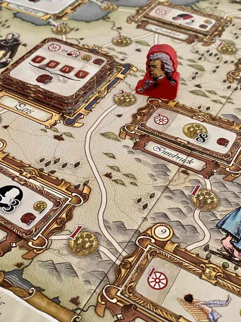 ° Voyager. Le joueur actif déplace le marqueur Mozart sur le plateau principal en payant les éventuels coûts de routes traversées (en Ducats). La destination atteinte permet de gagner des récompenses inscrites sur la tuile (Ville ou Cour royale), soit instantanées, soit permanentes, soit de fin de partie, contre l’acquittement de son coût en points d’histoire de Voyage.