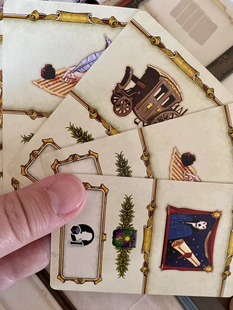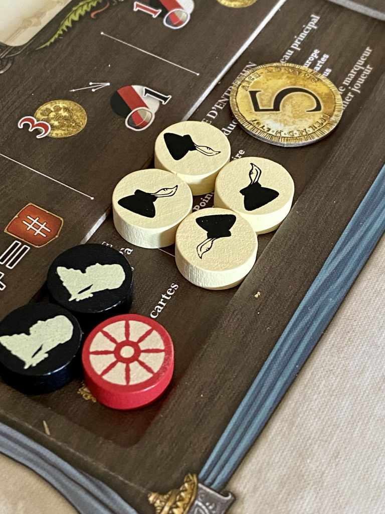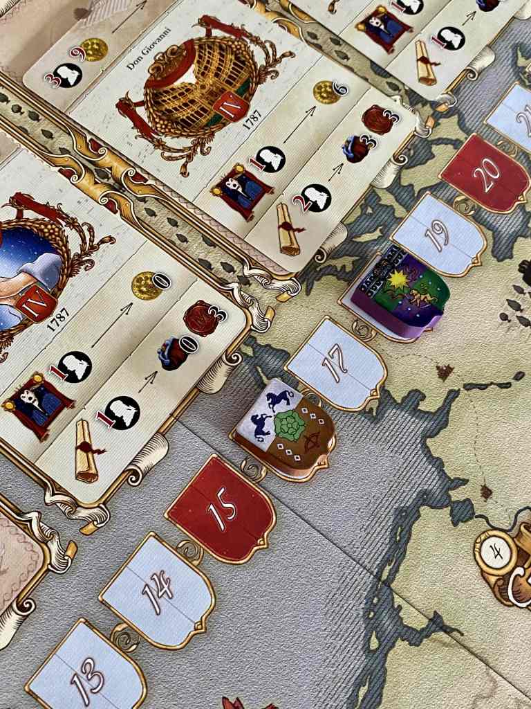 Les tensions se révèlent alors ailleurs, notamment dans les nombreuses interactions que proposent les différentes zones de jeu. Les cartes Souvenirs et Opus sont souvent le théâtre de convoitises, tout comme les tuiles Villes, octroyant des bonus immédiats, ou les tuiles Cour, permettant des « scoring » de fin de partie. La Composition du Requiem, quant à lui, joue sur des majorités pour agiter tout le beau monde autour de la table. Les joueurs auront à cœur de court-circuiter les envies adverses en tentant d’avoir sans cesse un coup d’avance pour progresser dans leur propre parcours. En effet, ce sont bel et bien les tuiles Cour récupérées, qui donneront une ligne stratégique pour évoluer efficacement.
