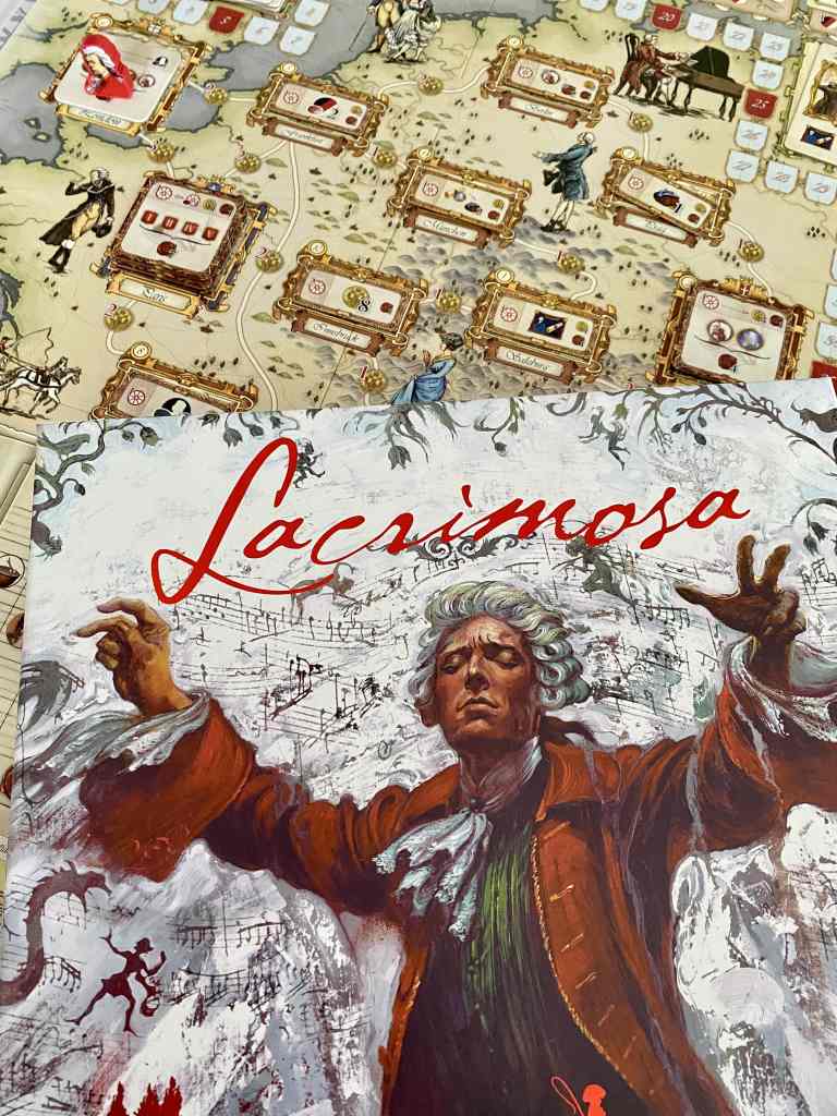 LACRIMOSA frappe fort dès les premières secondes de par son esthétique très léchée et un thème particulièrement singulier et attirant. Attardons-nous quelques secondes sur son matériel abondant, superbe et magnifiquement illustré. Certes, on peut lui reprocher son petit côté « too much » qui rend la prise d’informations quelquefois moins évidente, mais très honnêtement, l’impression visuelle est époustouflante. L’illustration somptueuse de la boîte est, en ce sens, très représentative de la qualité éditoriale entière du titre. Ensuite, il est difficile de rester insensible à la thématique musicale proposée. Les joueurs vont marcher sur les pas de Mozart pour tenter de devenir un disciple réputé. Même si la mécanique prend clairement le pas sur l’histoire racontée, les participants auront tout de même l’impression, légère, il est vrai, d’évoluer dans le thème promis. D’ailleurs, les explications historiques qui rythment le livret de règles sont bienvenues pour comprendre certains aspects du jeu. Mais on ne va pas se mentir, les joueurs que nous sommes éviteront ces lignes pour se concentrer sur l’essentiel, à savoir le « comment » plutôt que le « pourquoi ».