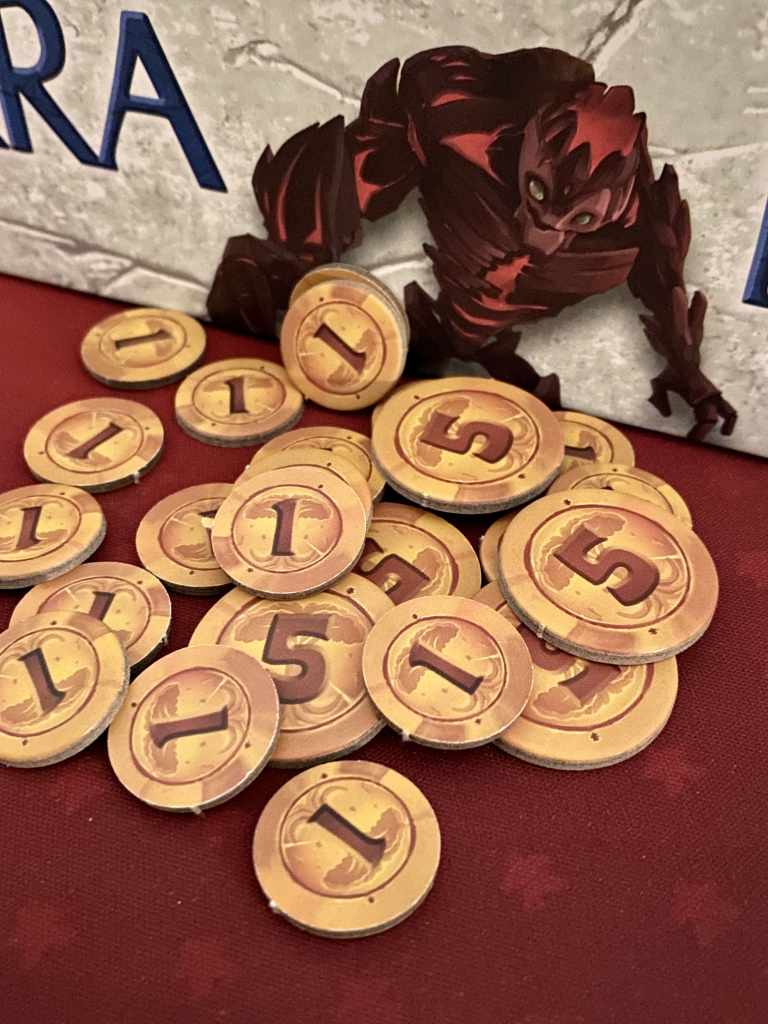 – Fin de manche. Lorsque tous les joueurs ont passé, les jetons X placés sur les actions de pouvoir ou spéciales sont enlevés pour à nouveau être choisies. Les tuiles Bonus non sélectionnées reçoivent une pièce et la tuile Décompte intermédiaire de la manche achevée est retournée.
