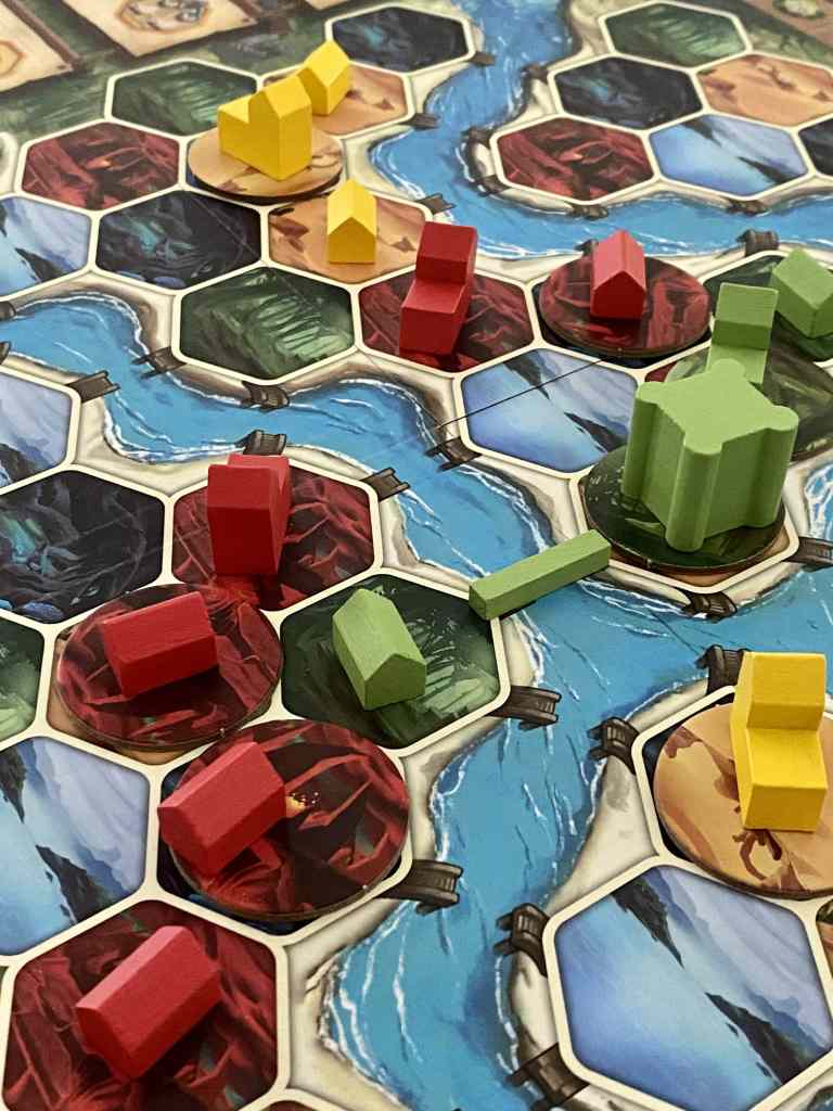 ° Améliorer des Bâtiments. Il s’agit de convertir une Maison en Comptoir (Coût : 7 ou 10 pièces selon la d’un bâtiment adverse adjacent) ou un comptoir en Palais (Coût : 14 pièces). Chaque bâtiment construit est retiré du plateau personnel du joueur actif de gauche à droite alors que chaque bâtiment retiré du plateau principal retourne dans l’emplacement disponible le plus à droite du plateau personnel du joueur. La construction de bâtiments permet de faire apparaître des revenus supplémentaires. Chaque construction réalisée à côté d’un bâtiment adverse fait gagner du pouvoir à ce concurrent. Les Palais offrent des capacités permanentes. Les bâtiments sont porteurs d’une valeur (Maison : 1, Comptoir : 2, Palais : 3). Dès qu’au moins quatre bâtiments d’un même joueur adjacents ont une valeur totale de 7, une ville est créée et permet de tirer profit d’un des quatre avantages des tuiles villes possédées par les joueurs.
