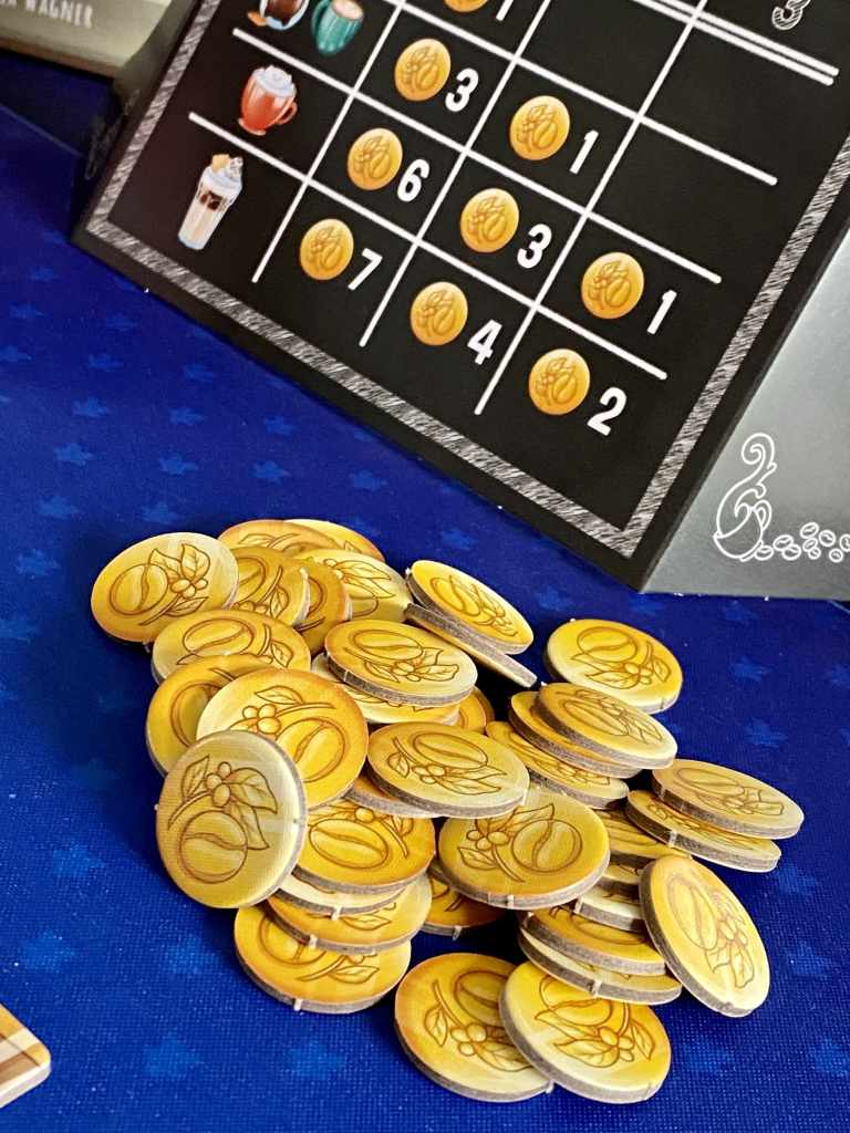 Cette thématique est d’ailleurs particulièrement bien concrétisée, notamment par la « machine à expresso » ou les tuiles de « scoring » venant remplir les tasses de café une fois vendues. Oui, les joueurs vont devoir confectionner des cafés. D’ailleurs, on ressent toute l’onctuosité et la douceur de ceux-ci dans la mécanique du jeu. En effet, le système est simple, élégant et humble. Les participants peuvent soit acheter une tuile, soit récupérer de l’argent, soit vendre des cafés confectionnés à leur tour de jeu. C’est clair, net, précis.