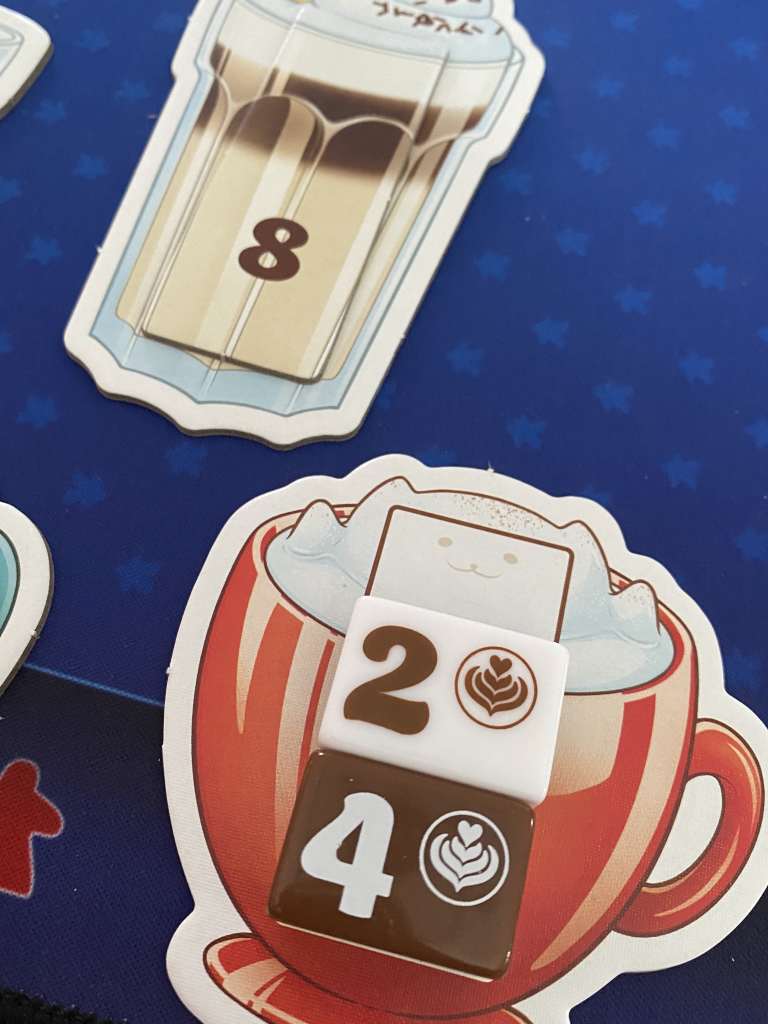 – Acheter un jeton Café ou Lait dans la machine à expresso. Le prix de ce jeton est déterminé par la valeur Barista du jeton d’à côté (plus supplément pour les jetons situés aux deux niveaux supérieurs). Le jeton récupéré est ensuite placé sur l’une des tasses du joueur actif, remplie toujours de bas en haut avec correspondance de couleurs. Enfin, un nouveau jeton est pioché pour remplir la machine à expresso.