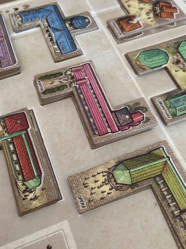 Certes, les joueurs vont construire leur principauté en construisant bâtiments prestigieux et environnement luxuriant. Sur le papier, je suis conquise. Clairement, le thème est là pour nous en mettre plein les yeux, mais très peu pour justifier la mécanique, pourtant imparable. Revenons sur cette mécanique, ou plutôt ces mécaniques. LES PRINCES DE FLORENCE associe des enchères avec de la pose de tuiles. Et le moins que l’on puisse dire, c’est que cela fonctionne à la perfection. Certes, le jeu a pris un petit coup de vieux et apparaît vraiment très très classique aujourd’hui. Mais quand les joueurs ne ressentent pas les presque 90 minutes de jeu, tous les doutes s’effacent. Les PRINCES DE FLORENCE est un grand titre, point, à la ligne.