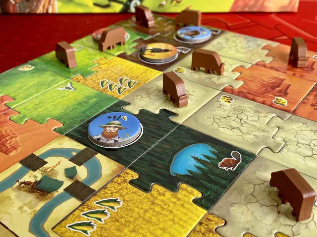 Mais le Far West remplace la thématique royale du jeu d’origine. Les vaches feront office de couronnes multiplicatrices et les coups vaches seront encore plus nombreux. En effet, les interactions ne se limitent plus aux sélections de dominos. Il est désormais possible d’engager des cow-boys capables de voler des bestiaux adverses non surveillés ou d’échanger une tuile de sa réserve contre une possédée par un adversaire. Oui, car la différence notable se situe bien dans la possibilité de conserver plusieurs tuiles devant soi avant de les placer dans son espace de jeu. Ces tuiles sont des moitiés de dominos à associer, tel un puzzle, comme bon vous semble. En termes de plaisir ludique et de manipulations, on atteint des sommets !