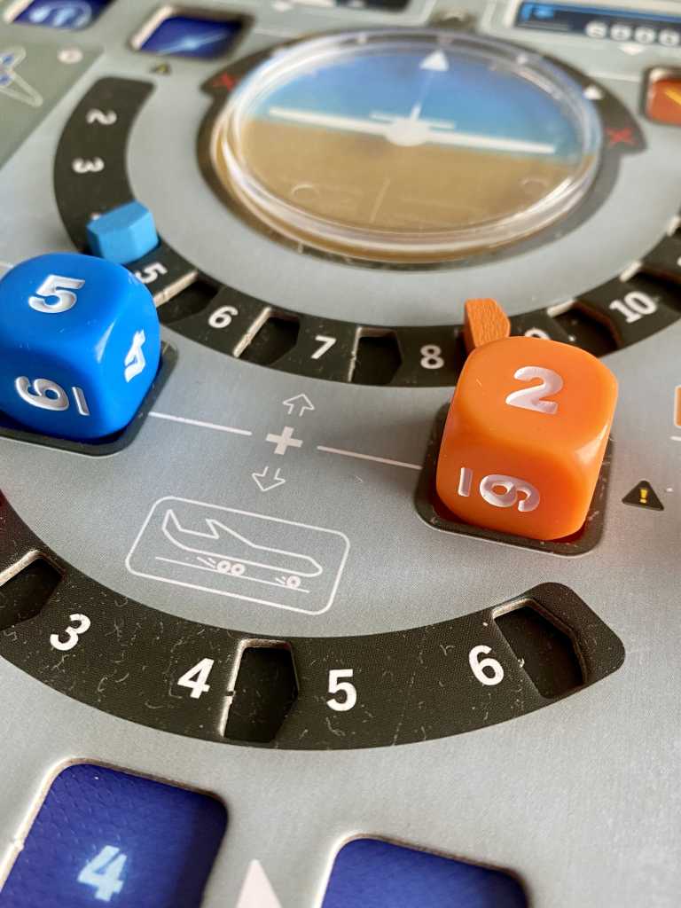 ° Réacteurs : lorsque les deux dés sont positionnés sur les deux emplacements correspondants, la somme de leurs valeurs détermine la vitesse de vol de l’avion. Si cette vitesse est plus faible que celle indiqué par le marqueur d’aérodynamisme bleu, rien ne se passe. À l’inverse, si elle est plus forte que le marqueur rouge, la piste d’Approche avance de deux cases. Si la somme se trouve entre les deux marqueurs, la piste d’Approche avance d’une case. Si la piste d’Approche doit avancer et qu’il y a un ou plusieurs avions sur la case Position Actuelle, ils rentrent en collision avec celui des joueurs, qui perdent immédiatement la partie.