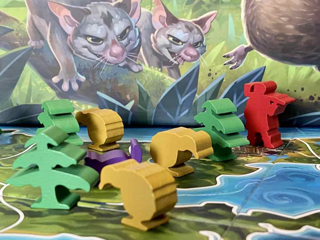 Si l’on doit résumer KAURI, on peut le caractériser comme un ROOT très accessible et familial. Pour ceux qui n’ont pas la référence, il peut aussi être associé à un jeu traditionnel comme Poule, Renard, Vipère. Les kiwis doivent sauver leur peau et se réfugier sous des arbres, les Possums doivent envahir le plateau, L’Anglais doit éliminer ces deux espèces alors que la MAORI doit embêter tout ce beau monde tout en construisant des temples. Vous l’aurez compris, les interactions sont fortes, et ce n’est pas pour me déplaire, et dans ce joyeux bazar organisé, le gagnant sera celui qui aura été le moins embêté.