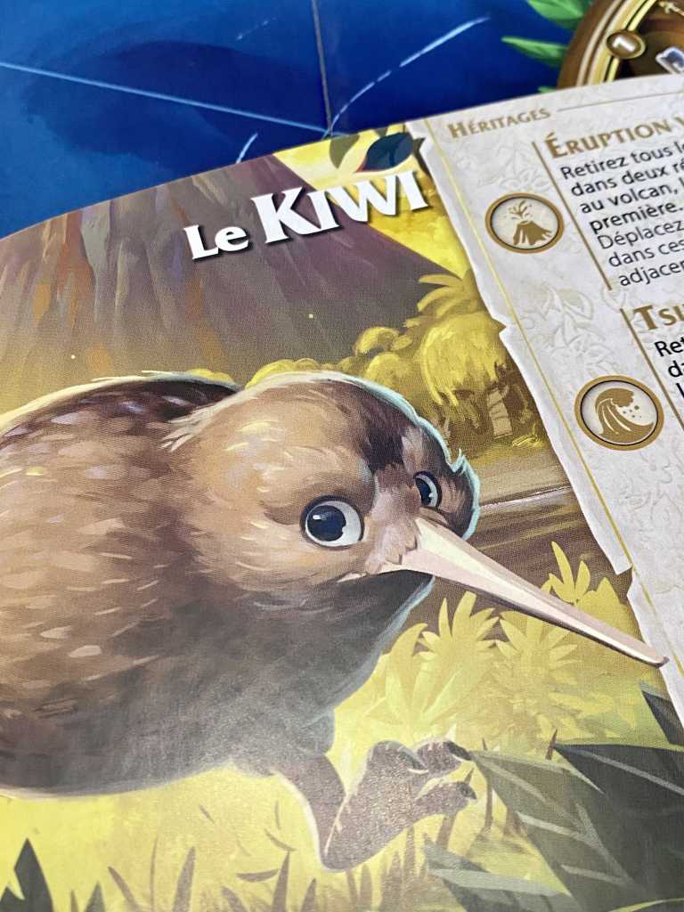 Aussi fantastique soit-elle, cette île somptueuse du Pacifique occupe rarement les premiers rôles thématiques du monde ludique. Quelle joie, donc, de découvrir que KAURI rectifie cet oubli et de belle manière, qui plus est. Si je dois avouer ne pas être éblouie par l’illustration de couverture, trop chargée, je dois constater la qualité du matériel, notamment celle des « meeples » Kiwi, Arbre et Possum. Le jeu possède une belle présence sur table, comme il est coutume de le dire, même si c’est encore trop plein à mon goût. J’aurai apprécié des différences notoires de taille entre les éléments pour un peu plus de cohérence, mais ceci reste un détail.