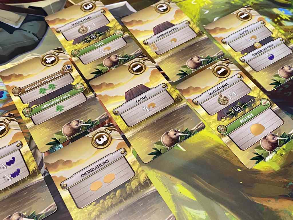 Une période se termine lorsque les pioches des joueurs sont épuisées. Leur défausse est alors mélangée pour former une nouvelle pioche. Les Kiwis non abrités par un arbre sont retirés du plateau. Les éventuels jetons Évènement (Inondation ou Épidémie) sont également enlevées. Le compteur de Conscience avance de deux cases (il détermine la possibilité d’effectuer certaines actions) alors que le compteur de Périodes progresse d’un cran.