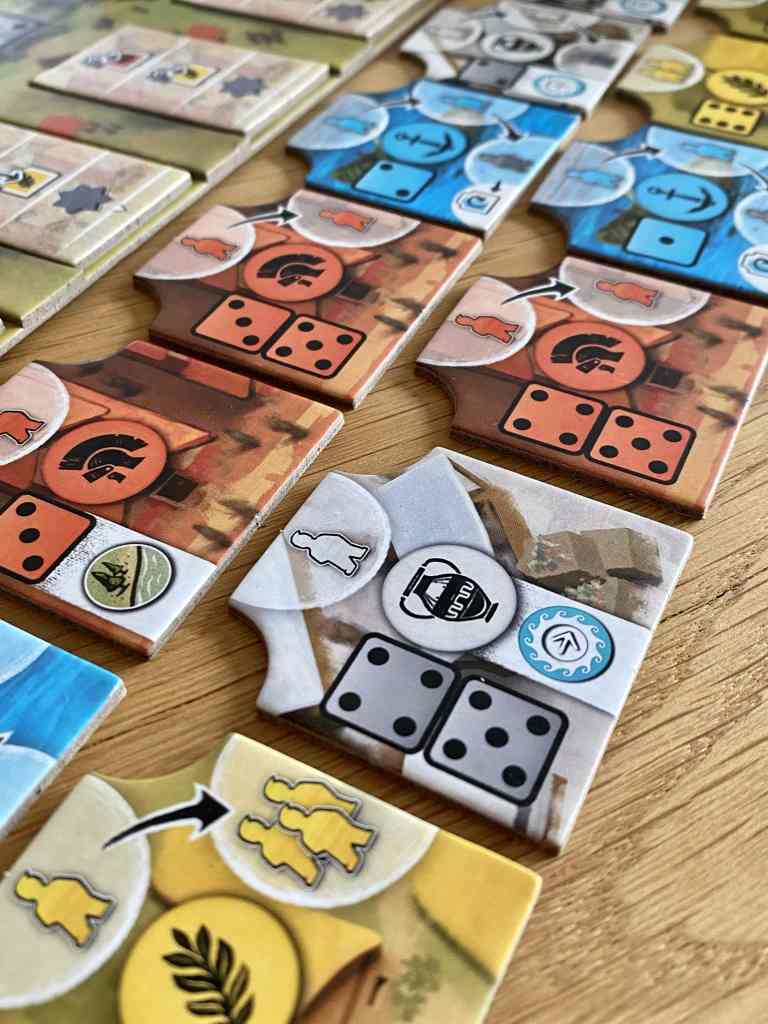 ° Construire un bâtiment. Il s’agit de prendre une tuile Bâtiment de la colonne du dé choisi et de la positionner sur un emplacement libre de sa Cité correspondant à son type : les Bateaux vont sur les Ports, les Casernes sur les Forts, les Échoppes sur un Marché, les Fermes dans un Champ.