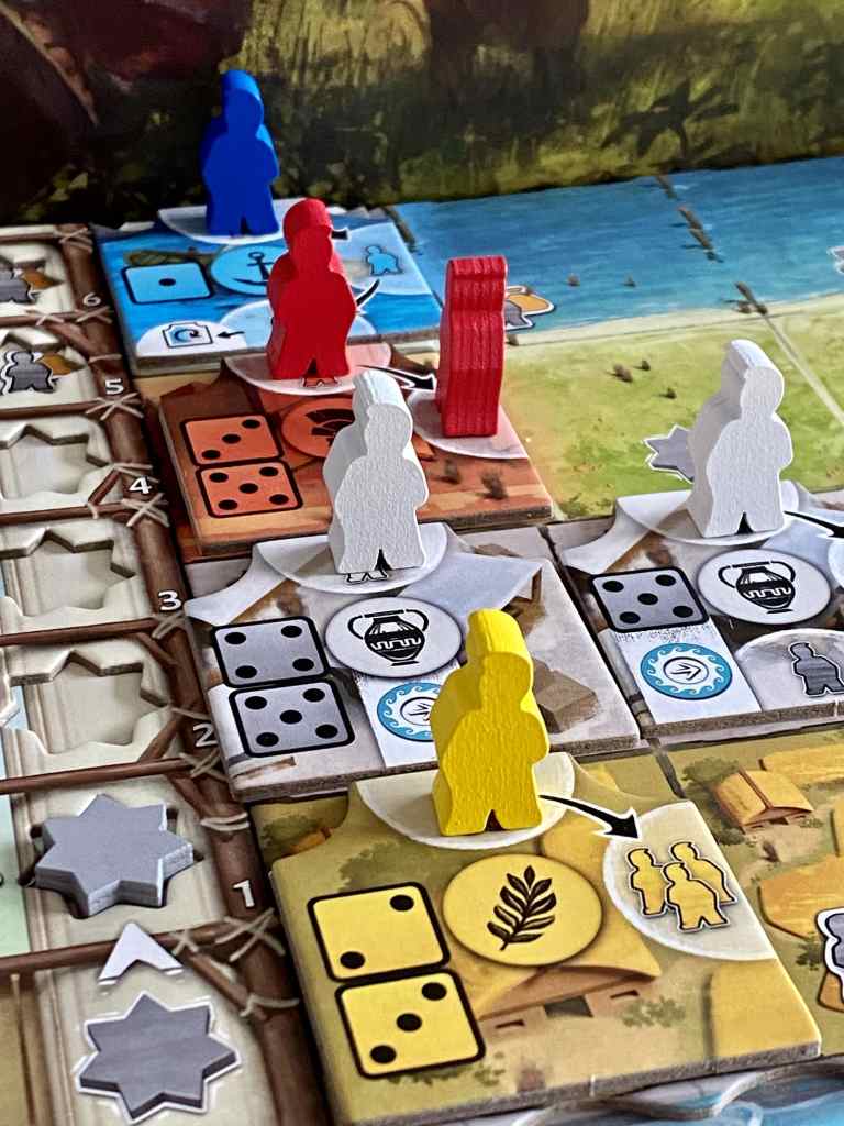 + Expédition et Amélioration. Lorsqu’un joueur positionne une étoile sur une de ses deux pistes, il bénéficie de l’effet présent sur la case complétée. Les bonus les plus importants sont la construction de Tours, permettant de lutter plus facilement contre les Barbares ou d’effectuer des échanges précieux d’ouvriers, l’avancée du marqueur Aqueduc, ou encore le gain de modificateurs, utiles pour changer une fois par année la valeur d’un dé.