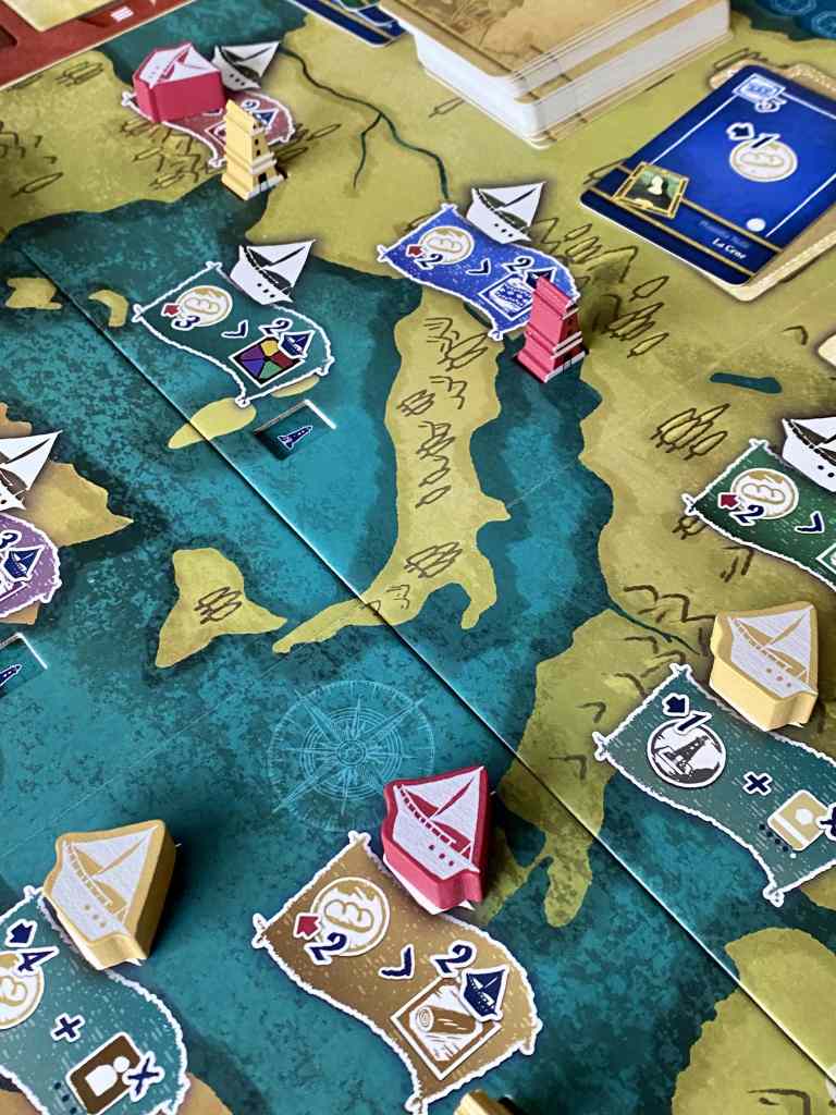 Le thème est également très bien concrétisé, notamment dans cette gestion de ressources, représentée par les vas et vient de nos bateaux. C’est vrai qu’il ne monopolise pas nos attentions, mais quand même, à bien y réfléchir, AMALFI est drôlement bien fichu de ce point de vue là. Les bateaux servent à la fois d’ouvriers dont la pose détermine l’action entreprise, mais également de ressources à consommer. Ainsi, un bateau est envoyé en Sicile pour être chargé en vin, par exemple, et ces conteneurs redeviennent disponibles une fois déchargés. Tout est logique et véritablement original. Oui, AMALFI est un jeu de pose d’ouvriers et de gestion de ressources pas tout à fait comme les autres.
