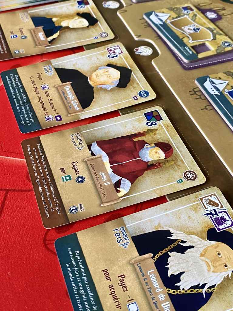 ° Acquisition. Le joueur actif choisit l’une des cinq cartes de l’Atelier, dépense les ressources indiquées sur celle-ci (avec un éventuel malus ou bonus selon sa position), et la récupère. Il gagne les points de victoire qu’elle porte et son effet immédiat.