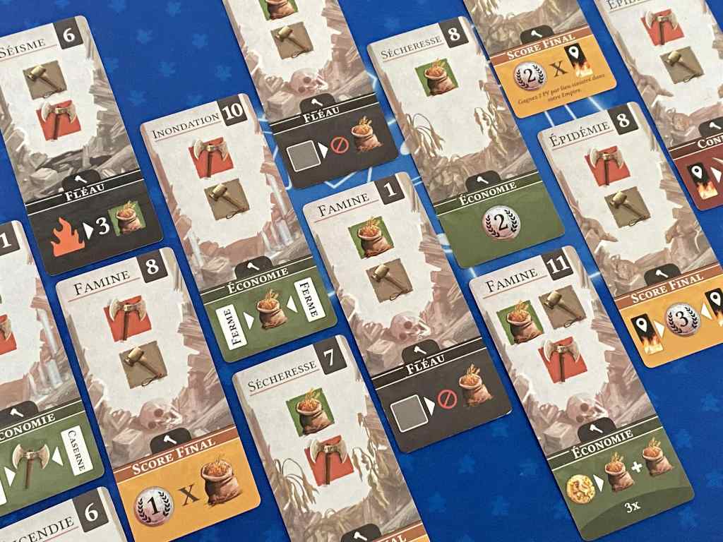 De ce point de vue là, je ne suis pas déçue. EMPIRE’S END se révèle extrêmement singulier. Les joueurs débutent la partie avec un capital de points qu’ils doivent essayer de conserver le plus possible face à des catastrophes diverses. Il s’agit d’un jeu de survie en quelques sortes, sur fond de civilisation. Côté thématique, on ne va pas se mentir, on a connu plus joyeux. On ne dansera pas la Carioca autour de la table. Les tours de jeu s’enchaînent entre Épidémies, Incendies ou encore Famines. Vous reprendrez bien un peu d’espoir dans ce monde à feu et à sang ?