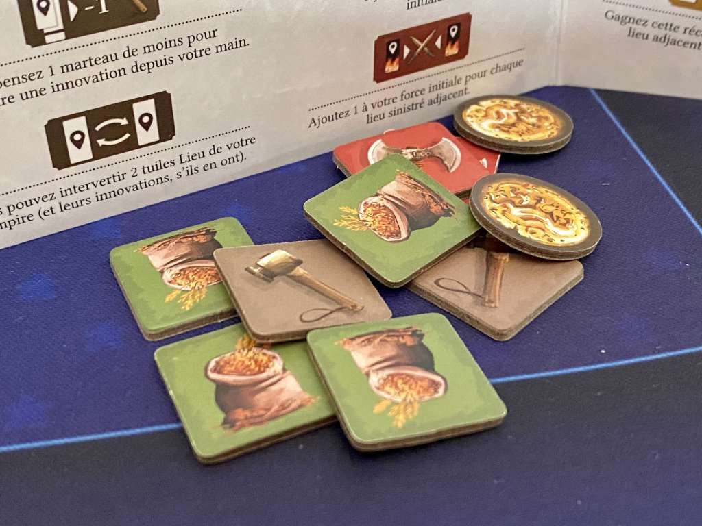 – Fléau. Une carte Fléau est révélée et cible un lieu dans tous les Empires. En commençant par le Premier joueur et en sens horaire, les participants choisissent entre combattre ou subir ce Fléau. Dans le premier cas, ils doivent dépenser une ressource indiquée sur la carte et la poser à côté de celle-ci. Dans le second cas, il s’agit de recevoir le marqueur Premier Joueur, de récupérer toutes les ressources dépensées lors de cette phase, de détruire le Lieu ciblé en retournant la tuile (qui devient alors inactive) et d’ajouter la carte Fléau sous une tuile Lieu prospère pour rendre son Innovation active.