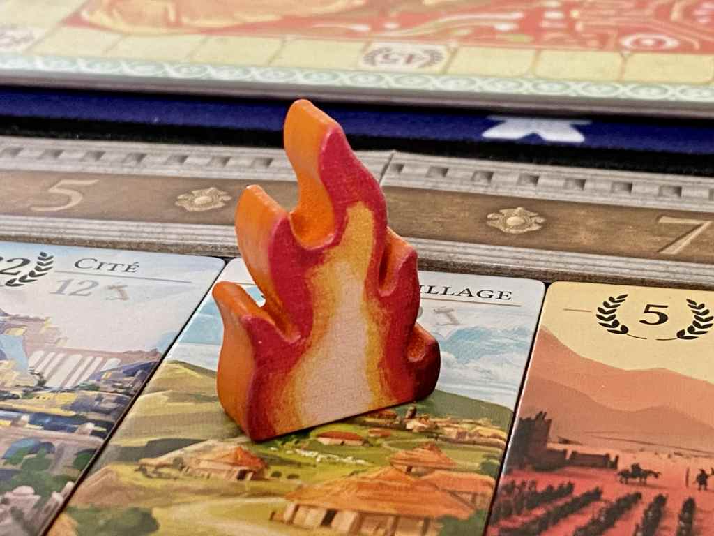 Pourtant, les joueurs vont devenir de véritables acteurs, notamment lors des phases d’enchères et d’amélioration de leur zone de jeu. La première consiste en un « stop ou encore » de sacrifices de ressources pour ne pas subir de destruction. Les choix sont tendus et cornéliens. Les joueurs ont pour objectifs, évidemment d’échapper à une catastrophe synonyme de perte de points de victoire, mais aussi si jamais cela devait se produire, de récupérer le plus de ressources possibles ainsi qu’une carte Amélioration la plus intéressante qui soit. C’est donc en perdant qu’on devient plus fort ! Le tout est de savoir quand perdre, lorsqu’on en a le choix.
