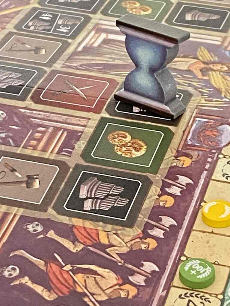 Le deuxième moment important consiste à « customiser » son Empire en achetant des Améliorations ou en échangeant deux tuiles lieux. Si cette dernière option ne paraît pas primordiale lors des premières parties, elle s’avère pourtant essentielle à la mise en place de combinaisons efficaces ou pour simplement défier les autres joueurs sur un terrain asymétrique. Je m’explique, il sera sans doute plus facile de conserver une tuile à 32 points contre quelqu’un qui possède 6 points à la même position. À noter que ces deux options, Amélioration et Échange, rappellent un autre titre de John D. Clair, tout aussi excellent, à savoir SPACE BASE.